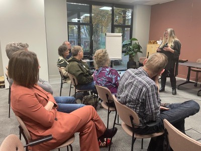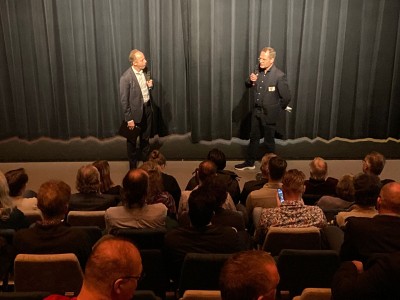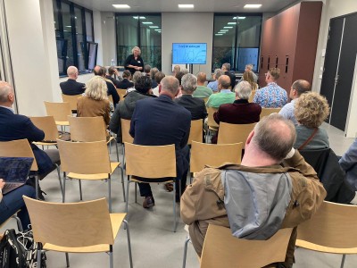 KNVI-duovoorzitters Wouter Bronsgeest en Paul Baak heetten het publiek in de theaterzaal van Huis van Ermelo van harte welkom en nodigden ze uit de theatervoorstelling 'AI en het Eeuwige Leven' te gaan zien.